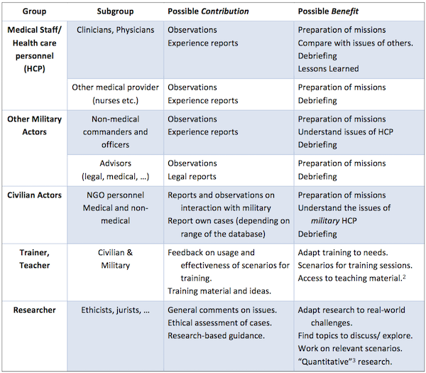 Past stepsThe desideratum of a MME case collection has been reiterated during a joint workshop of the MILMED COE and ICMM RefC held in Munich on 14-16 September 2015. The CMME has participated actively in that workshop and agreed to establish the MME case database in close cooperation with the ICMM RefC. It was agreed, that the MILMED COE will be consulted and invited to contribute to the database project and that it will be open to other interested persons or institutions from both academia and the military. Relevance of realistic case scenariosThe collection of observations and reports on ethical challenges for military medical personnel during missions has been proven to be difficult for several reasons. For example, those returning from missions can on the one not be easily approached by outsiders and they may also be reluctant to openly talk about their experiences. Main aims of the databaseThe project shall offer an environment and workflow that allows on the one hand to enter cases and observations and, on the other hand, to access the case collection via database queries in order to get selected collections e.g. based on issues. Thus, the database will on the one hand offer a forum to (anonymously) report observations from missions. On the other hand, over the time and as these reports come in the database will grow up to offer to trainers and researchers an extensive collection of issues and scenarios that are informed by real-world experiences and constitute actual challenges in the field. In addition, short analyses and introductory comment documents on the ethical aspects of central issues (like mixed loyalties, medical rules of engagement etc.) shall be written and be published to provide a basic guidance to analyse the scenarios or to use them during training. These documents will be linked to the relevant scenarios according to keywords. Target Audience: Who benefits and contributes?The target audience of the case collection are both practitioners (medical staff, other military and humanitarian actors, trainers) and researchers in universities or think-tanks. Both groups can benefit in very different ways from the collection and their respective contributions are of great value for the other group, too. The following table provides an overview on who can contribute to and benefit from the collection in different ways.